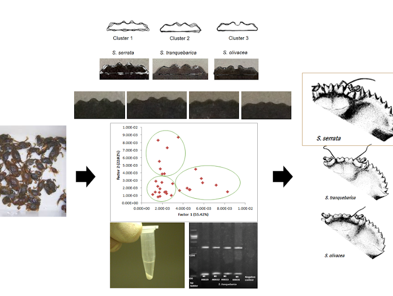 Of the three mangrove crab species in the Philippines, Scylla serrata, or the giant mangrove crab, is capable of growing faster and bigger compared to S. tranquebarica and S. olivacea. There is no obvious morphological marker to distinguish one species from the other. Genetic markers were used to identify to species juvenile mangrove crabs and image analysis was used to find consistent physical markers on the shell of the crab to represent the species. This process won the 2015 Outstanding Research and Development award of the Philippine Council for Industry, Energy and Emerging Technology Research and Development.