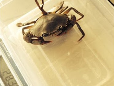 A juvenile crablet being measured prior to processing.